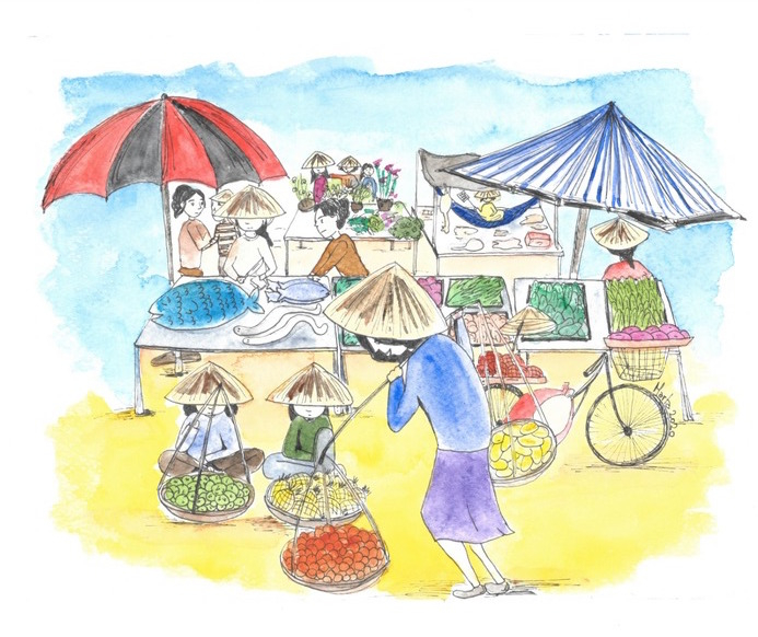 Senza farmi scoprire ho seguito una donna che portava sulle spalle un bastone di bamboo a cui erano legati due cesti, in uno dei mandarini, nell’altro dei mango. Ho imitato la danza con cui attraversava gli incroci e mi sono fermata solo quando si è fermata lei, per fare colazione con zuppa di Phở. Ci siamo perse in vie strette, abbiamo sfilato per discreti tempietti e audaci negozi e infine abbiamo raggiunto il mercato centrale. Era un tripudio di colori e odori: banchi di fiori e di spezie, di pesci mai visti, di tartarughe marine e anguille; banchi di gamberetti essiccati, di verdura esotica, di frutta secca; banchi di carne con al centro appese amache su cui siedono donne, a sventolare instancabilmente stracci che tengono lontane le mosche.
