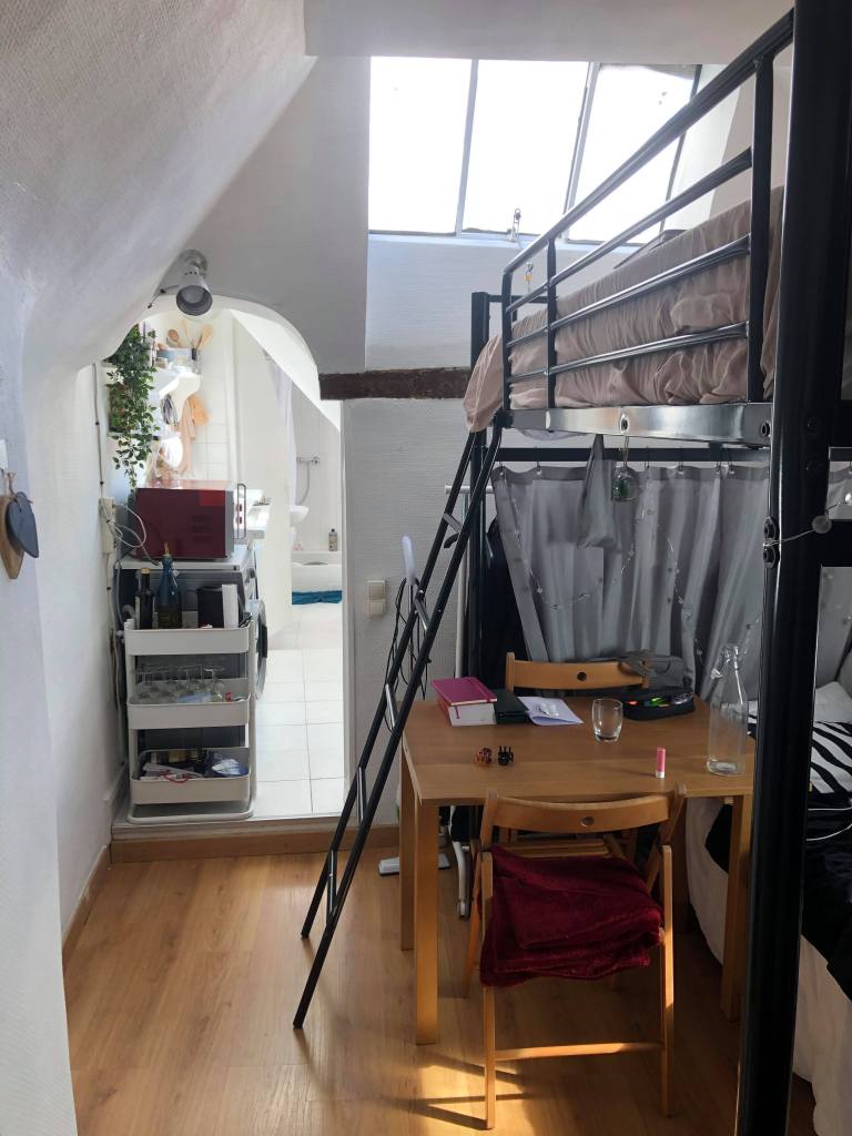 La più giovane dei ragazzi intervistati è Sara, ventenne, studentessa di sociologia a Padova e ora in Erasmus a Science-Po. A Parigi abita in una mansarda di 9 m2 al settimo piano del VI arrondissement, a Saint-Germain-des-Prés, a due passi dall’università. La sua casa potrebbe sembrare a molti un posto da incubo, per le dimensioni ridotte e per quel gabinetto proprio accanto alla cucina. Per lei però questo spazio è diventato con il tempo il suo angolo di mondo su Parigi. I tetti, mi racconta, appaiono come una distesa marina per il loro colore bluastro, specialmente adesso che è tutto fermo e che i gabbiani si stanno riappropriando della città.