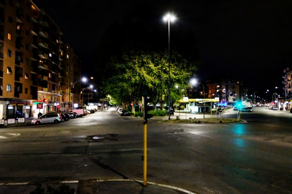I palazzi, con luci colorate che nascono dalle case, sono laboriosi alveari rettangolari; dietro ad una sedia vuota, alla giusta distanza sociale, immersi nello spazio più scuro. Le strade appaiono fiumi puliti e silenziosi, le piazze fino a poco tempo fa erano luogo di manifestazione, mentre adesso i lampioni sono gli unici elementi illusoriamente vitali.