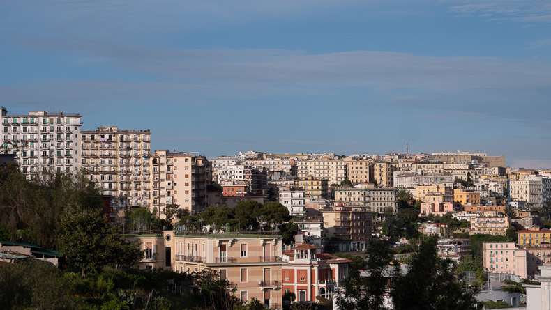 La collina immortalata nella scena è il Vomero, quartiere collinare di Napoli e il suo passato recente è simile a quello di molti quartieri italiani nel dopoguerra. Estesa campagna di masserie piantate a broccoli fino a metà ‘900, con il boom economico, l’aumento demografico e le brame speculative di costruttori e politici, cede a un’urbanizzazione selvaggia che in pochi anni ne ha stravolto il paesaggio. Folte schiere di edifici si ammassano lungo l’area tra l’elegante nucleo ottocentesco e la collina di Posillipo, facendo del Vomero, con la vicina Arenella, il quartiere più densamente abitato della città.