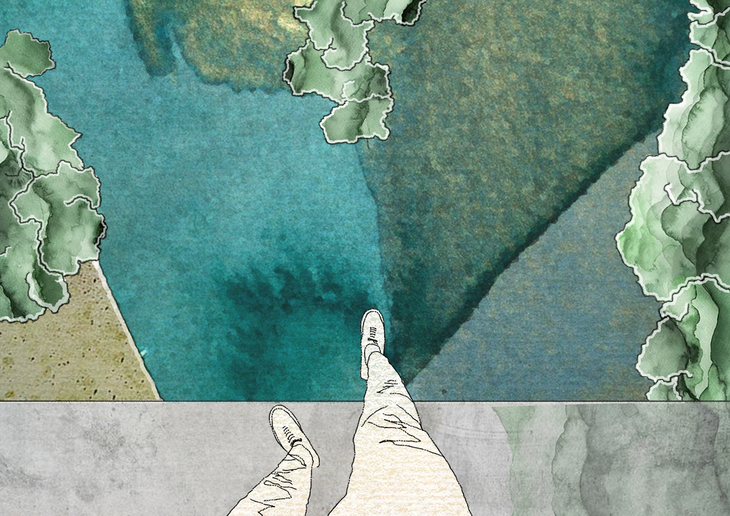 Guardo in basso. Sono immobilizzato. Sotto di me ci sono 25 metri di altezza. Provo a concentrarmi sui colori del fiume. In giornate normali, il Reno, colorato di bronzo, confluisce nel Rodano cristallino, dando vita a sfumature di azzurro, in grado di calmare i più profondi turbamenti. D’inverno, quando la malinconia mi affligge, vengo qui al tramonto. Il vento, l’odore delle montagne e il sussurro delle foglie rendono i miei pensieri silenti, portando un po’ di pace nel mio cuore. Nella desolazione più completa, mi piace osservare i giochi delle correnti. Il verde smeraldo della Jonction normalmente mi infonde forza.