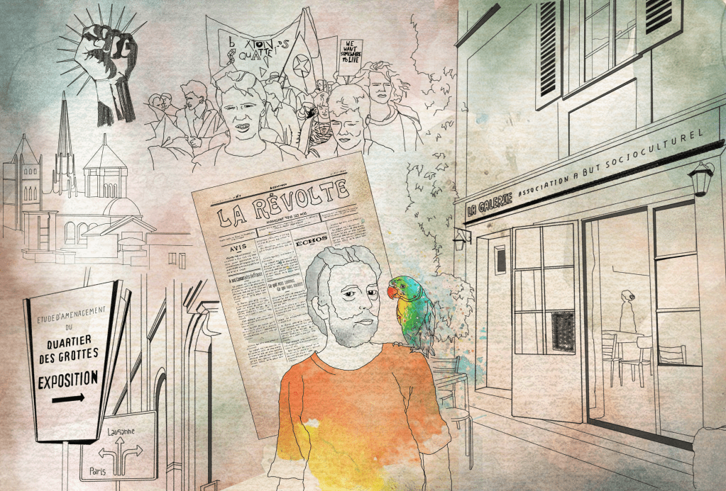 Quartiere Les Grottes, bar La galerie, luogo di resistenza. Mi sta confondendo, io pensavo che Ginevra fosse la città dei banchieri, del lusso, istituzioni e buona cocaina. AIA! Il pappagallo per rubarmi una nocciolina mi ha morso il dito. Qui, dove mi trovo oggi, mi racconta Kamal, Kropotkin nel Febbraio del 1870, fondò il giornale anarchico-comunista La Révolté. Continuo a bere. Forse mi dovrei fermare. Chiedo un altro bicchiere di vino. Alla fine costa solo 2.5 franchi. Pago, mi giro e il mio nuovo amico è già arrivato agli anni 70 del ‘900. Squats, associazioni popolari e femministe contro la demolizione di edifici storici. Nel 1980, Ginevra contava 160 luoghi occupati che lottavano contro la speculazione edilizia di quegli anni. Contro di loro era stato istituito un corpo di polizia apposito, Brigade de Squats. Kamal si è commosso. Il barista ci offre due bicchieri di vino.