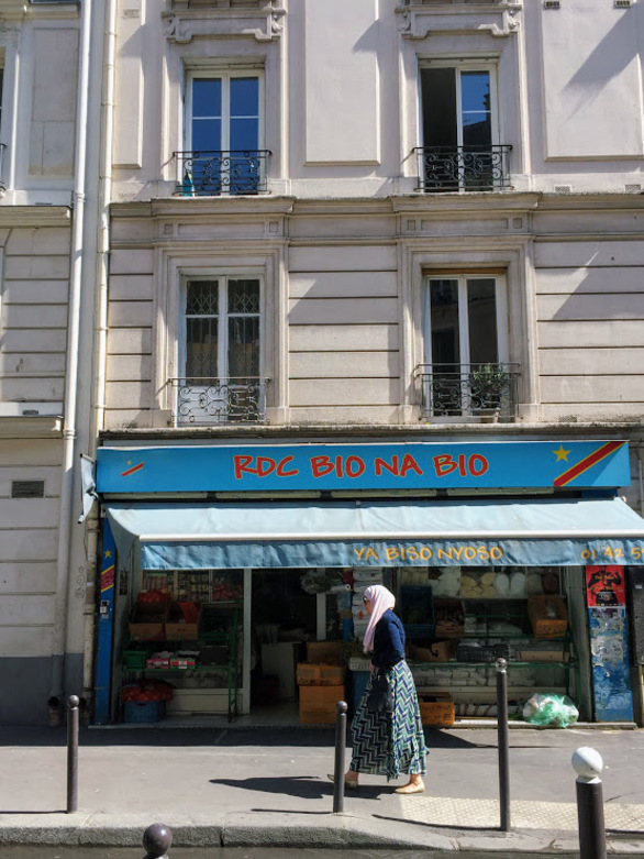 Mentre il mercato volge al termine, le strade si svuotano e la calca si allenta. Il sole batte fortissimo e fa brillare i vestiti sgargianti e i copricapo delle donne e degli uomini del quartiere. Risalendo verso nord, in direzione della Rue Marcadet, mi imbatto nelle vetrine delle sartorie africane traboccanti di stoffe multicolori che, in questo periodo di post-pandemia, espongono mascherine dalle fantasie vivaci cucite artigianalmente. Nella stessa via ritrovo il negozietto di musica e cinema africano (l’interno schermato da decine di copertine di album e DVD attaccate ai vetri), i parrucchieri afro, le profumerie e i saloni di bellezza a buon mercato, le macellerie ḥalāl.