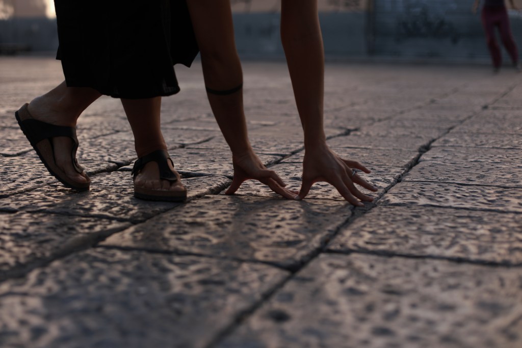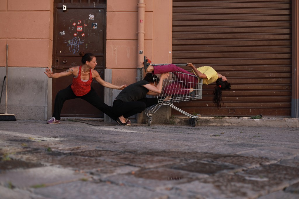 Danziamo e i bambini si avvicinano a noi, smettono i loro giochi incuriositi dalla novità. Noi li integriamo al nostro movimento, impariamo da loro che imparano da noi. Uniamo l’architettura dello spazio alla nostra danza, come quelle colonne alte e grosse del Tribunale. Ci scambiamo di posto, giochiamo sui livelli e sulla relazione tra le persone e lo spazio della città. Integriamo la politica: siamo corpi di diversa provenienza, cultura, religione, genere, storia, età, impegnati in una coesistenza che crea resistenza, preparati al dono e all’incertezza.