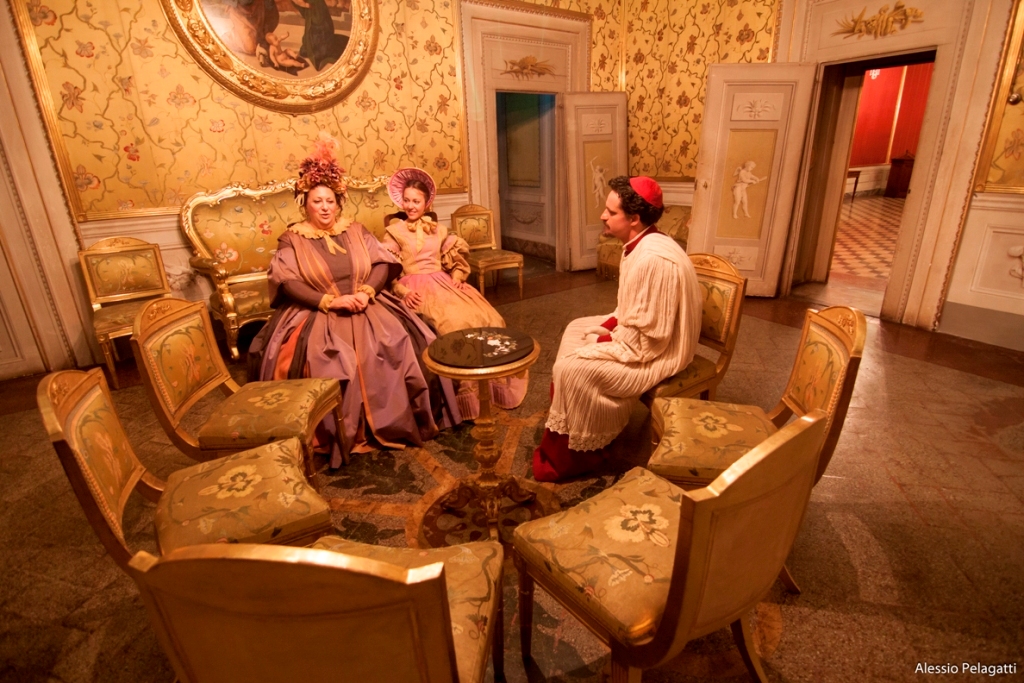 Ma dalla commozione si passa al divertentissimo spettacolo L’ospite illustre, nelle stanze del Museo di Casa Martelli, ubicato in una viuzza stretta e biforcuta all’ombra del “Cupolone”. Sconosciuto ancora a molti perché abitazione privata fino agli anni ’90, la Compagnia ha qui ambientato una tipica serata conviviale ai tempi del grand tour, un ottocentesco interrail nelle capitali europee ritenuto fondamentale per il percorso di formazione dei giovani rampolli di buona famiglia. Ad accogliere il pubblico, che non è più fatto di contemporanei ma di Conti, Marchesi e di uomini cultura di quel tempo, vi è un paggio in livrea che ha il compito di guidare i signori alla scoperta delle particolarità della casa, come il fumoir rosa cipria per sole donne, o degli ospiti attesi, come il Marchese de Sade o un certo Giacomo Leopardi.