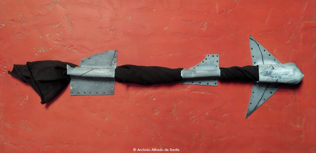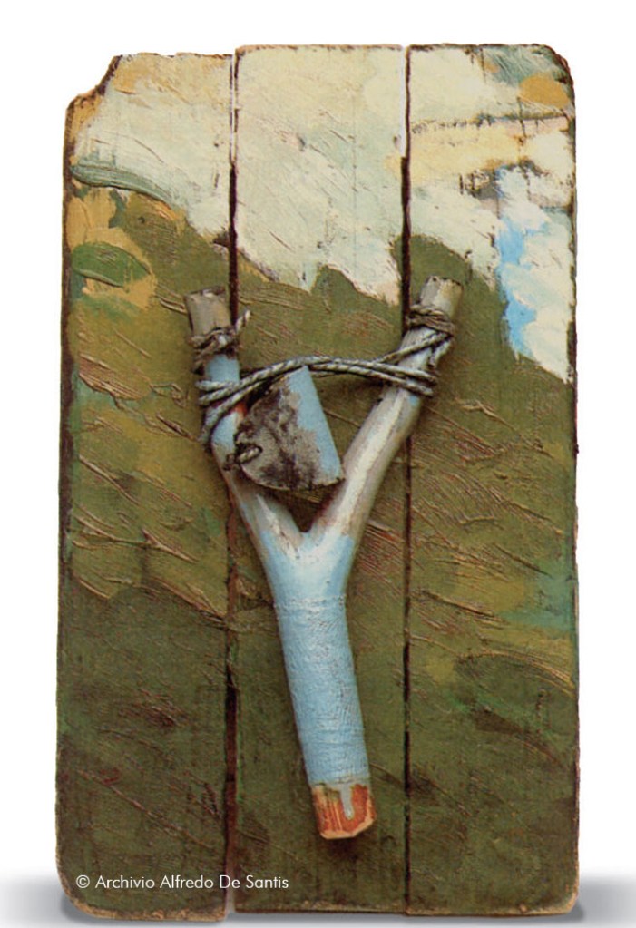«Alfredo de Santis è un progettista che conosce il limite delle due discipline, per cui ne utilizza la potenzialità, senza mai sfondare completamente i confini dell’una e dall’altra: questa qualità si chiama professionalità, che significa anche rinunciare alla facilità di una mano e di una tradizione artistica, per evidenziare invece, la necessità etico politica di una chiarezza e semplicità linguistica». Queste le parole di Aldo Colonnetti, filosofo, storico e teorico dell’arte. La commistione con il cinema, la pittura, il disegno creano nell’opera di Alfredo una grafica con una forte valenza pittorica. La fionda, seppure sia una scultura è una dimostrazione di quanto detto. Come ancora ci racconta Colonnetti: «La fionda è un pretesto, è una forma, non è un simbolo; ma la sua struttura geometrica consente le più svariate utilizzazioni. Alfredo de Santis ricerca quale grafico e pittore, le potenzialità semantiche di questo strumento, senza perdersi in un gusto esclusivamente decorativo o strettamente funzionale al committente. È come se la cultura progettuale di de Santis, una volta messa in moto intorno a un’idea, a un intuizione, insegua ostinatamente una meta che è sempre oltre: La grafica come ricerca di nuove potenzialità comunicative.